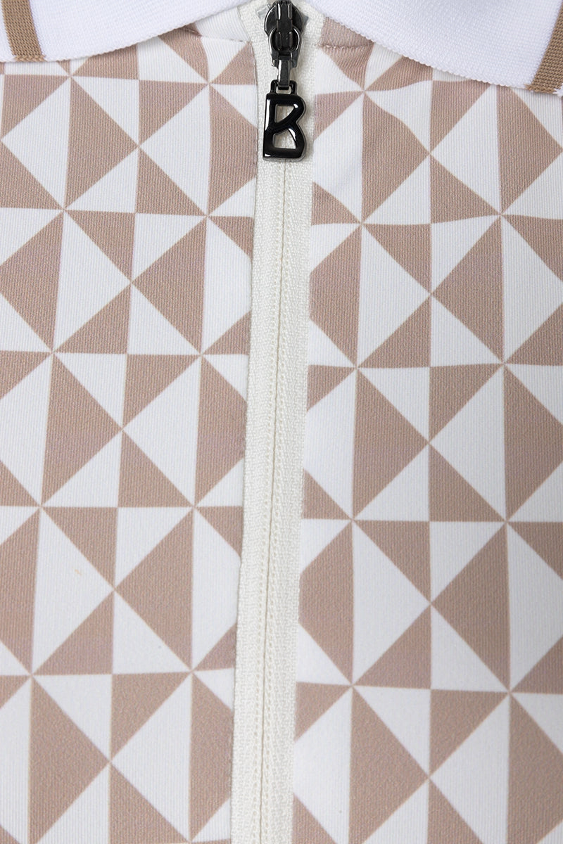 Bogner Women’s Calista Polo with a knitted collar and cuffs featuring contrast stripes, a front zipper, and unique sublimation prints for a bold, stylish look.